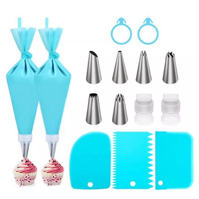 15 Piece Cake Decorating Supplies with Reusable Pastry Bags and Tips, Standard Converters, Silicone Rings, for Cupcake Icing, Cake, and Cookie